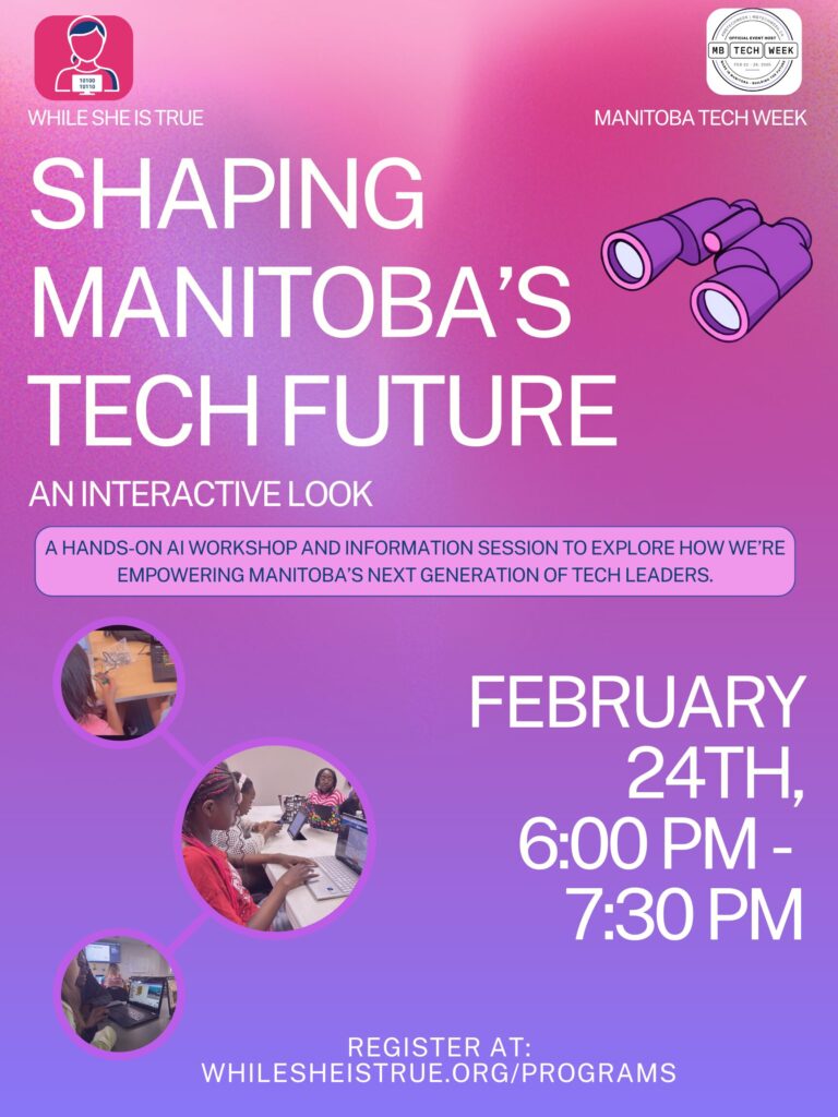 In this event, we will dive into the future of Manitoba’s tech landscape by exploring how our organization, While She is True (WST), is empowering the next generation of girls in technology.